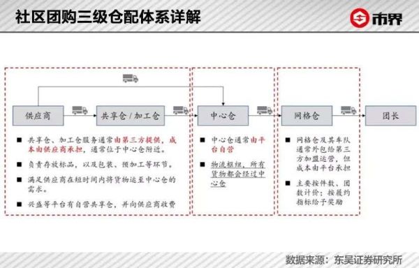 社区团购采用三级仓配体系:平台一般会在晚11点/12点停止接单,并将当天汇总的订单下发给供应商,商品经由各处供应商送至中心仓,再配送至多个网格仓,进而送至各自提点,用户自行前往自提点取货。各自提点的负责人,被称为团长。