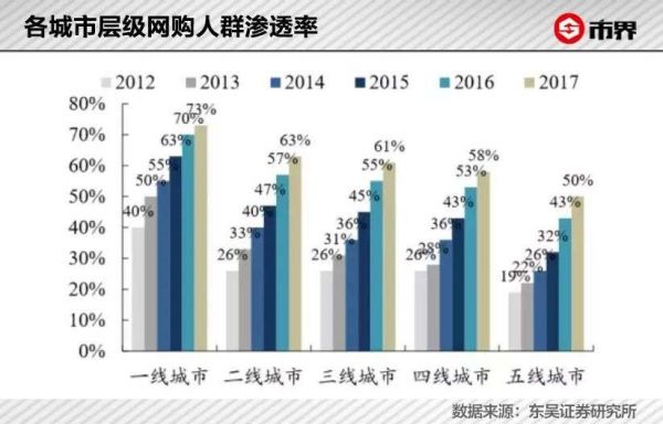 获取新流量并不容易,业内公认的“蓝海”在下沉市场。数据显示,低线城市网购人群渗透率明显低于一二线城市。2017年,一线城市网购人群渗透率已经达到73%,而五线城市仅为50%。