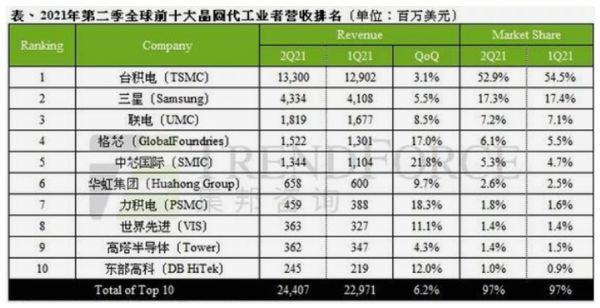 这是全球十大晶圆代工厂中,中国大陆仅有的两家上榜企业,分列世界第五和第六。