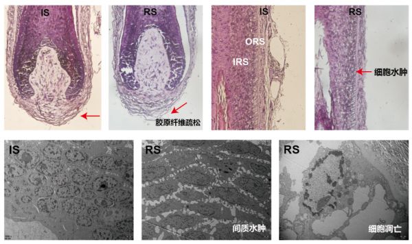 不同保存液保存后毛囊结构变化(IS,毛囊微器官拟生态保存液;RS,林格氏液)