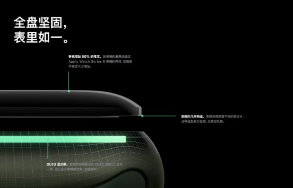 其次,这块屏幕的坚硬度也提升了一个档次,在官网中苹果表示这款手表支持抗裂、IP6X级认证的防尘、50米级防水等特性。这几个特性主要是通过加厚表面镜片、将传感器集成在屏幕面板上等操作所实现的,不过这也会带来一些弊端,比如重量会有所增加(同为铝合金版本,S7要比S6重2.4g左右)。