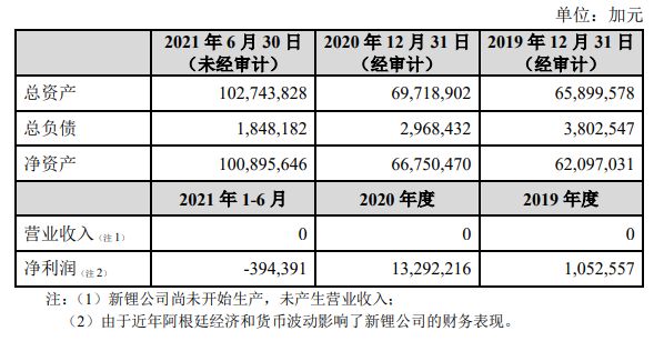 Neo Lithium的财务数据显示,由于其此前尚未开始生产,其近两年多均为实现营收,而2019年、2020年及今年上半年实现净利润分别为105.26万加元、1329.22万加元、-39.44万加元。
