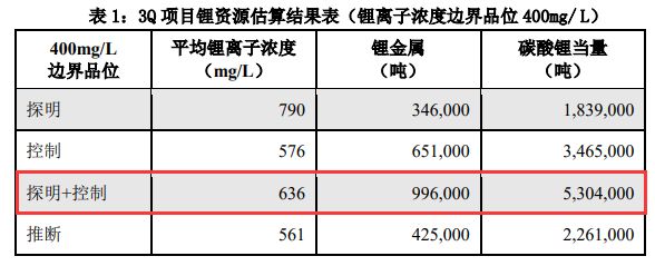 公告显示,根据Neo Lithium在今年6月更新的评估报告,3Q项目碳酸锂当量总资源量约 756.5万吨,其中,探明+控制级碳酸锂当量资源量为530.4万吨,平均锂离子浓度为636mg/L。