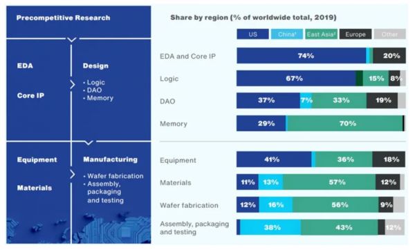 从上图看中国在全球市场的份额更加具体。在芯片设计方面,EDA/IP领域中国仅占3%,DAO领域占7%,逻辑芯片与存储器芯片领域更是少得可怜,与美国云泥之别;在晶圆制造方面,中国占比16%,但基本是中低端产品;在半导体产业链三环节中非核心的封装测试方面,中国占比38%;在半导体材料方面,中国占比13%,但是在SiC、GaN等第三代半导体材料发展上仍落后1-2代;在半导体设备方面,占比微乎其微。