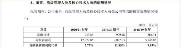该券商人士进一步讲到,“再比如招股书申报稿中,18/19财年、19/20财年、20/21财年,联想集团高管们的税前薪酬分别是5.65亿元、9.09亿元和9.34亿元,占比除税前溢利分别达到了9.83%、12.85%和7.77%。”