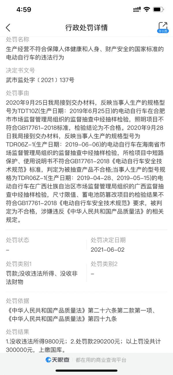 研发费用偏低,在一定程度上影响着小牛电动车的产品质量。天眼查信息显示,因小牛电动规格型号为TDT10Z、TDR06Z-1的电动自行车在监督抽查中经抽样检验,存在照明项目、短路保护、蓄电池防篡改等项目不符合《电动自行车安全技术规范》标准,被判定为不合格,涉嫌违反《中华人民共和国产品质量法》的相关规定。处罚结果为罚款290200元并没收违法所得9800元,以上罚没共计30万元。