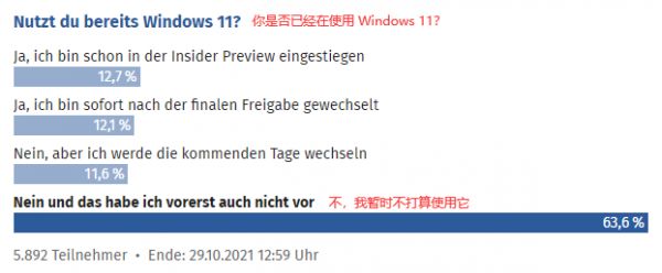 或许是之前关于 Windows 11 的负面评论太多,也或许是受到了 FSF 活动经理这番言论的影响,在近日德国 ComputerBase 网站组织的关于 Windows 11 升级情况调查中,超过 63% 的网友都决定暂不升级 Windows 11 系统: