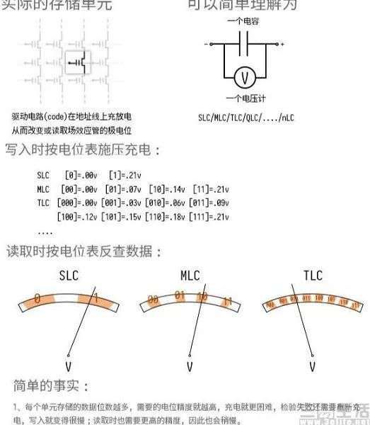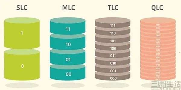 SLC、MLC、TLC和QLC其实是按照储存单元(cell)里存储的信息数量来进行区分,其中SLC是固态硬盘的最初形态,每个储存单元只储存1bit的电位,只有0、1两种电压状态;MLC的每个储存单元储存2bit的电位,有2^2=4种电压状态;TLC的每个存储单元存储3bit信息,有2^3=8种电压状态;QLC的每个存储单元则可存储4bit信息,有2^4=16种电压状态。