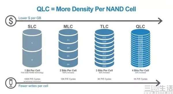 既然每个存储单元存储的信息提升了,自然也就意味着在同一尺寸的晶圆上,假如QLC颗粒能够做到1TB的容量,那么TLC就只能做512GB,MLC能做256G,SLC上就可以做到128GB了。不过由于闪存存储信息的模式,是通过遂穿效应让存储单元捕获电子来实现,这就意味着密度增大的同时,会导致不同电压状态变多且越难控制,使得写入所用时间变长、理论擦写次数减少,以及读写速度减小等情况出现。