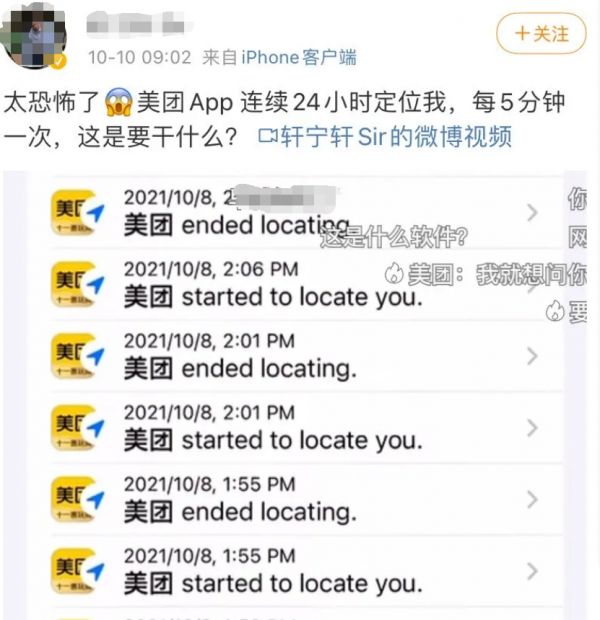 10月10日,有数码博主爆料称,在升级苹果手机iOS 15后,安装某隐私记录软件之后发现,美团在后台连续24小时进行了定位。而前一天,在同样的路径下,有网友发现iOS版微信、QQ、淘宝等应用也出现同样情况。