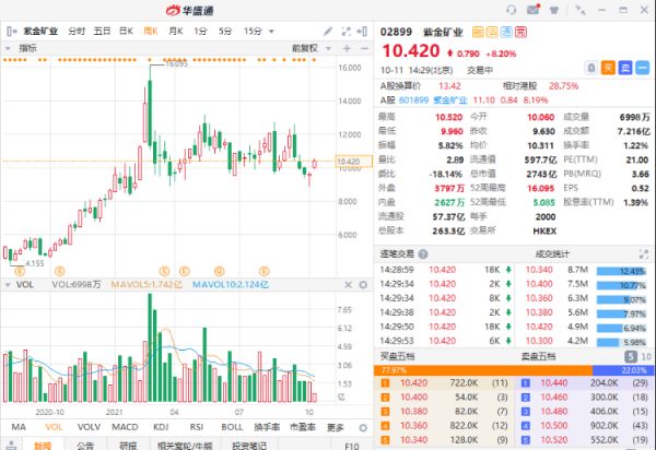 截至2021年10月11日盘中,紫金矿业AH股一度大涨超8%,此前从2020年8月至2021年2月紫金矿业港股走出过一波从4.15港元持续上涨至16港元的行情,累计涨幅超过285%。