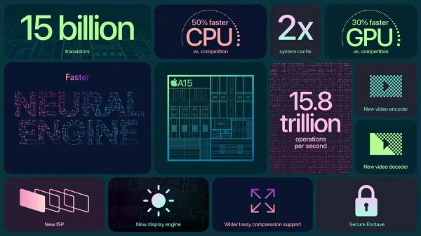 A15处理器为苹果自研新一代手机处理器,基于台积电第二代5nm工艺。与上一代A14芯片相比,集成的晶体管数量从118 亿个增加至150亿个(增加27%);搭载16核的神经网络引擎,AI算力高达15.8TOPS,与上一代A14芯片相比,算力提升了43.6%。性能方面,据 Geekbench 数据库显示:与A14相比,A15单核提升10%左右,而多核性能提高了18% 。