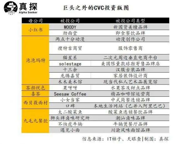 梳理投资版图可以发现,巨头之外的CVC的投资目的主要是围绕公司业务进行补缺、夯实或者拓展。比如,泡泡玛特的投资标的主要围绕潮流、动漫、二次元等与年轻人相关的品牌;内容平台小红书则青睐在平台上走红的品牌;喜茶、茶颜悦色的投资聚焦饮品赛道,九毛九、西贝则分别投了一些餐饮品牌。