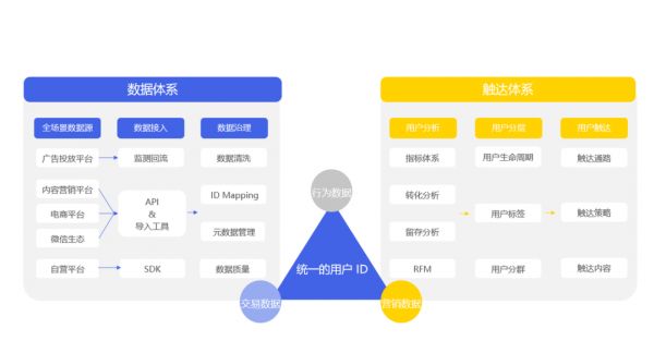 与此同时,连接两个体系的关键是统一的用户ID,企业需要基于用户的营销数据、行为数据、交易数据等构建统一的用户ID。在此基础之上,再去完善数据的采集、处理、实时计算与分析能力,以及在不同场景下与用户互动、构建亲密关系的触达能力、自动化能力与AI能力。