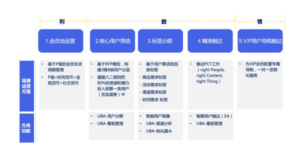 以聚变营销为例。聚变营销可以简单概括为三个字:“利”、“数”、“情”,通过这三个字可以把整个玩法分为会员池运营、核心用户筛选、标签分群、精准触达、VIP用户导购触达,五个步骤。