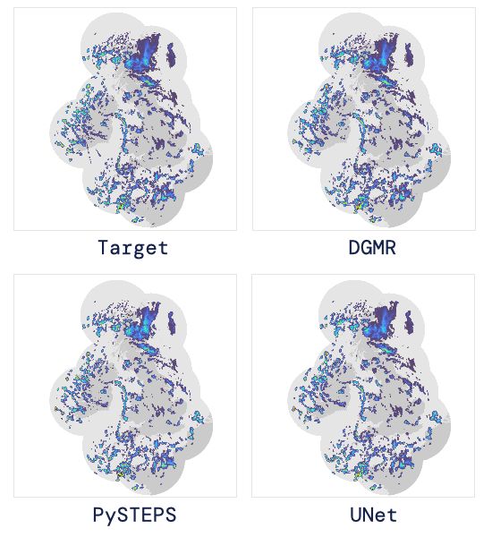 经由 56 名气象学家评判,与主流临近预报和其他机器学习模型相比,DGM 在 1536 km×1280 km 的区域内具有更真实和一致的临近预测,在 89% 的案例中比起其他两种方法更为准确和实用,临近时间为 5 到 90 分钟。