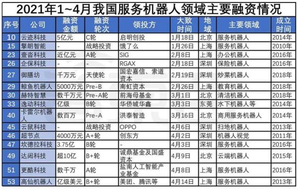 最后从资本层面看,餐饮服务机器人“钱”景光明。据相关数据统计,2021年仅1~4月服务机器人融资就多达15起,占全部机器人融资份额的22%,其中主打餐饮配送机器人的擎朗科技在9月完成2亿美元D轮融资,这也是中国商用服务机器人领域金额最高的单笔融资。资本的涌入加速了中国餐饮服务机器人在研发和供应链方面的发展,进一步推进服务机器人在餐饮行业的普及和落地。