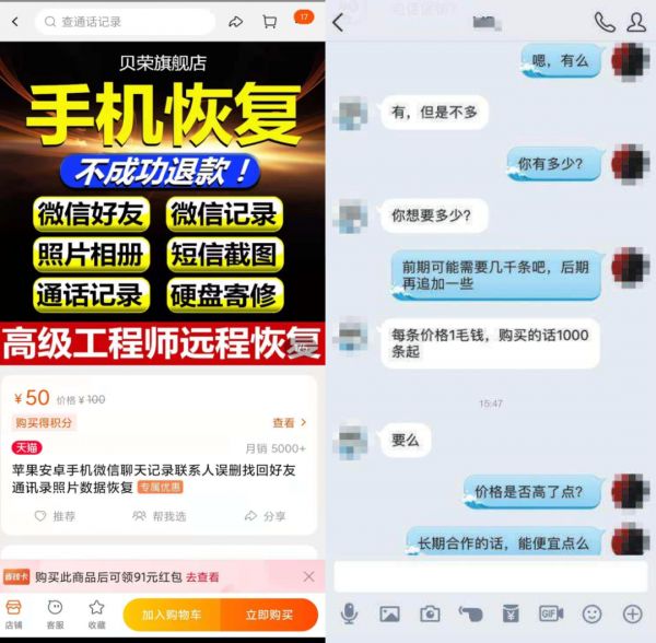 小雷在电商平台上面大致搜索了一下,确实存在着不少提供手机数据恢复服务的商家。经过一番询问,小雷了解到目前手机的通话信息数据恢复需要50-100元,照片视频等重要信息则需要更高的价钱。从用户的反馈情况来看,虽然隐私数据恢复成功率一般,但确实存在恢复成功的案例。