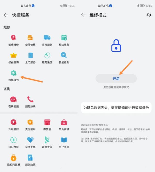 华为、荣耀的用户,打开“服务/我的华为”—“我的设备”—“快捷服务”—“维修模式”即可。
