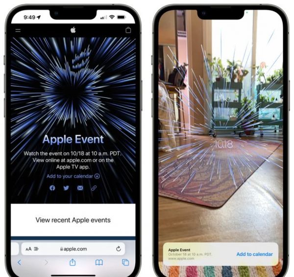 本次发布会的邀请函和上一次秋季新品发布会一样,Safari 浏览器进入苹果官网,可以点击 Logo 查看 AR 邀请函。扩散的光束中间写有发布会的日期,大家可以体验一下。