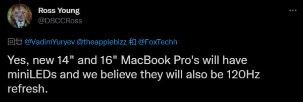 今日,分析师 Ross Young 在推特表示,相信新款的 MacBook Pro 14/16 会有 120 Hz 高刷屏,但态度并不十分确定。