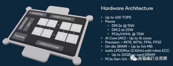 在高通方面,Cloud AI 100芯片于今年上半年正式发货,其INT8最大算力可达400 TOPS,最大功耗(PCIe版本)则75W。根据高通公布的资料,其设计采用了多核架构,每个AI Core上拥有8MB的SRAM,最多在芯片上可以集成16个AI Core,并且这些AI Core会共享LPDDR4X DRAM,以及PCIe接口。值得注意的是,高通的Cloud AI 100并没有像Nvidia一样使用HBM2内存接口,而是使用了功耗和带宽都更低的LPDDR4X接口,这意味着高通需要能更好地管理内存才能摆脱其在内存带宽方面的劣势。