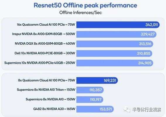 这次公布的MLPerf 1.1榜单中,基本可以分为几大势力:首先,是以Nvidia的GPU为核心加速卡的方案,由各种不同的厂商(包括Nvidia自己,以及超微、联想、戴尔、HP等整机厂商)实现的整机去跑分;其次是高通的云端加速卡方案,由高通自己提交跑分结果;第三类是Intel的CPU方案;第四类则是一些初创公司的方案。因此,在MLPerf 1.1的结果中,我们认为最值得关注的,就是高通与Nvidia之间的竞争。事实上,在一些测评项目中,高通的方案已经实现了比Nvidia更高的结果,这也说明在服务器推理市场,Nvidia遇到了一个强力的竞争对手,未来无法再高枕无忧。