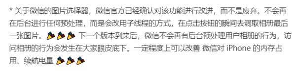 之前网友 @Hackl0us 称,关于微信的图片选择器,微信官方已经确认对该功能进行改进,而不是废弃。不会再在后台进行任何预处理,而是会 改用子线程的方式 , 在点击按钮的瞬间去调取相册最后一张图片 。