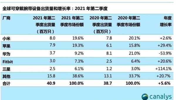 进入2021年,国产品牌在可穿戴设备上的情况才有所好转,单一品类上,2021年Q2季度小米在腕带上超越苹果,占全球智能腕带出货量的19.6%,苹果是19.3%。华为排在第三位,出货量为370万只,占据9.2%。