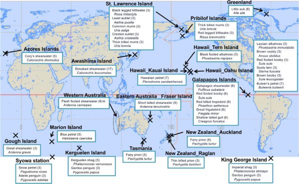 研究人员从世界各地 16 个不同地点的 8 个海鸟科(5 个目)中选择 32 个海鸟物种,在 2008 年至 2016 年间收集了 145 只海鸟的腺体油,通过检查海鸟尾部上方排出的预留腺体油中 BFR 和 6 种 BUVS 化学物质的浓度,来确定鸟类内部脂肪储存的污染物负担。