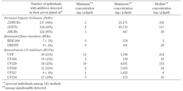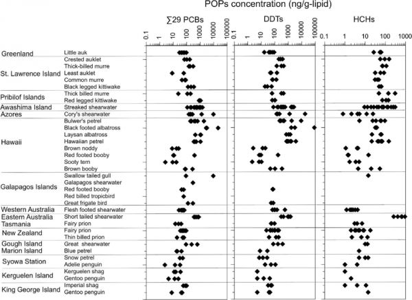 研究发现, 海鸟样本中普遍存在常规持久性有机污染物 ,在 145 个被检测海鸟样本中有 85% — 94% 个样本中均检测出了这类污染物,其中被检测频率最高、含量最高的是多氯联苯。研究人员还分析了不同地区海鸟样本腺体油中的多氯联苯(PCB)、二氯二苯三氯乙烷及其代谢物(DDT)和六氯己烷(HCH)污染物浓度。
