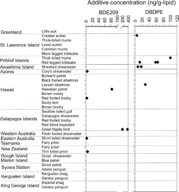 研究发现,塑料添加剂的出现模式与常规持久性有机污染物的出现模式不同,添加剂在海鸟油样中的出现更为零星。在 145 只采样海鸟中只有 7 只检测到了十溴二苯醚(BDE209)。而在采样的 145 个海鸟样本中,只有 9 只偶尔检测到十溴二苯乙烷(DBDPE),且检测出的 DBDPE 浓度与 BDE209 的浓度范围相似。
