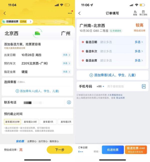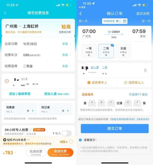 ▲左为飞猪,右为携程,多方案选择才能提升抢票成功率