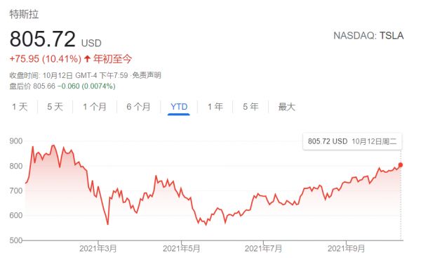 周二(10月12日),近期股价一路走高的特斯拉(TSLA)突破800美元关口,当日上涨1.74%,收于805.72美元。