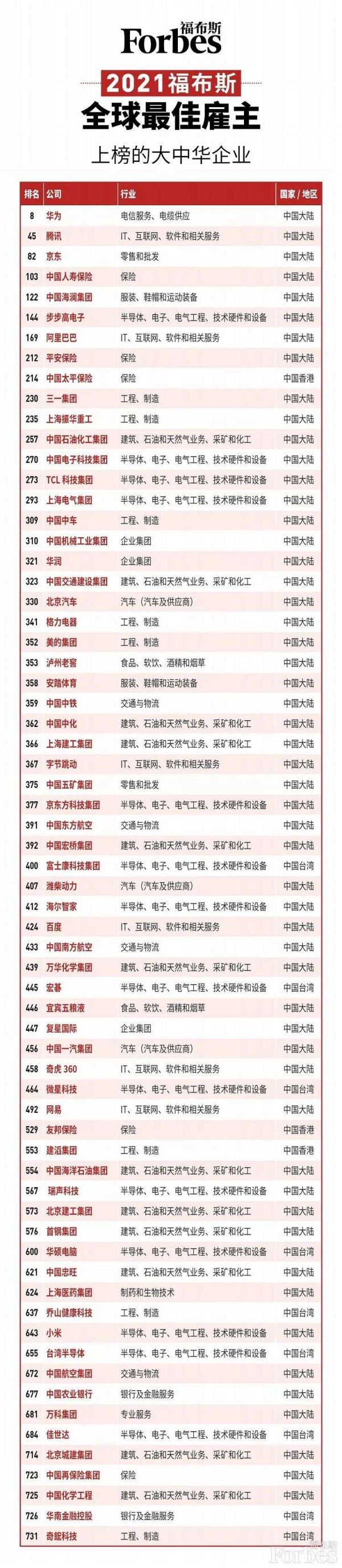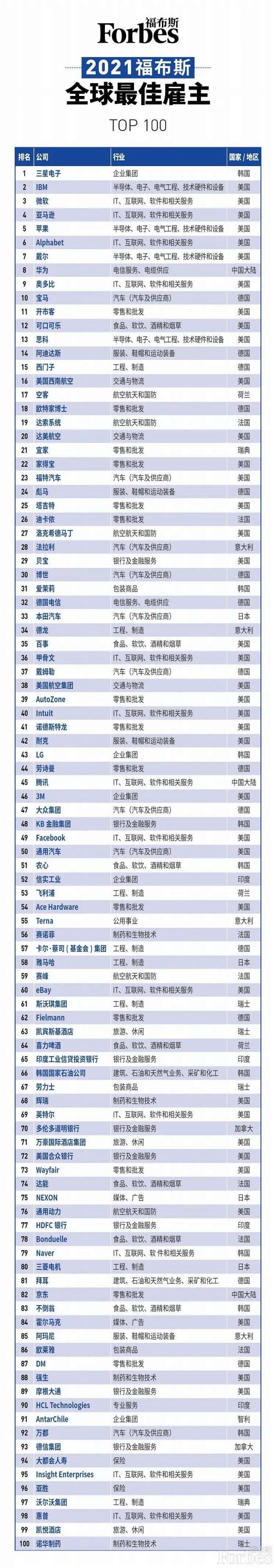 福布斯发布2021全球最佳雇主榜:华为前十,66家大中华区企业上榜