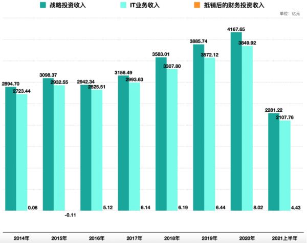 不但双轮“跛脚”,细看战略投资的收入来源也很“畸形”。2014年到2020年,来自IT业务(也就是联想集团)的收入,占战略投资总收入的比例平均为93.75%,最高时超过96%。