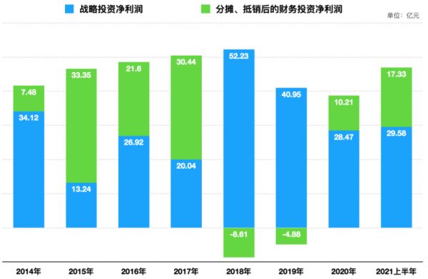 无论是战略投资还是财务投资,净利润表现起伏都很大,甚至有时候财务投资分摊、抵销后还亏损。