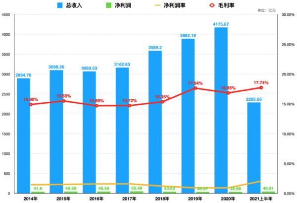 2014到2020年,联想平均毛利率为15.67%,wind数据显示,整个科创板2020年毛利率的中位数超过43%;2014到2020年,联想的平均净利率只有1.31%,而wind数据显示,整个科创板2020年净利润率的中位数为17%