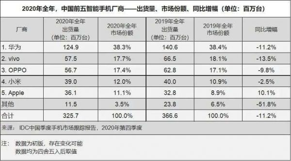 这一年,第三方调研机构IDC的最新数据显示,中国整体智能手机出货量约为3.26亿台,同比下降11.2%。华为、vivo、OPPO、小米、苹果名列前五,占据整个市场96.5%的份额。