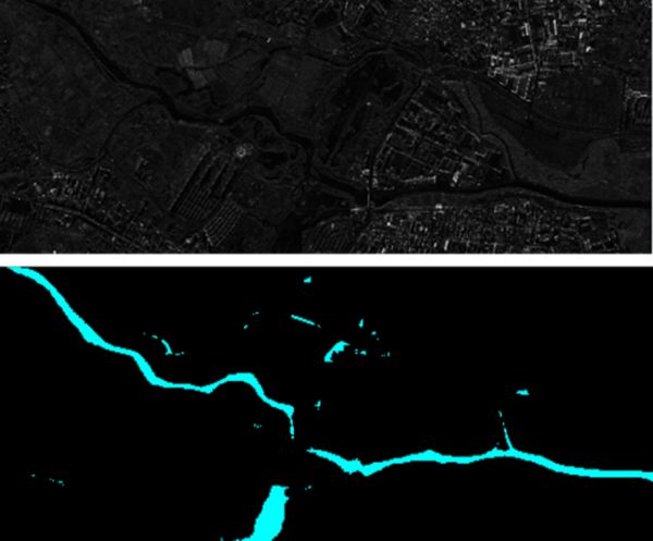 水体识别:通过在轨分析处理,能够将水体的边界快速提取下传,可应用于洪水的应急预警监测等(Copyright,2021,数据由天仪研究院和厦门大学提供)