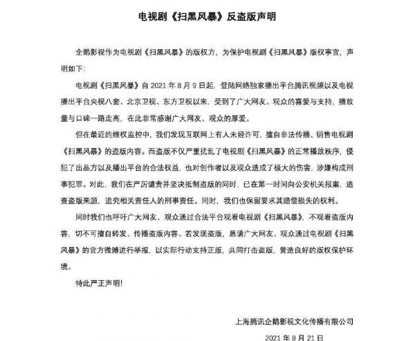 电视剧《扫黑风暴》发布的反盗版声明。图片来源:微博@扫黑风暴官微