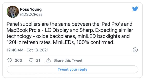 更令人期待的是,它们还可能搭载 120Hz 刷新率的 mini-LED 显示屏。根据 9to5Mac 援引 Display Supply Chain Consultants 分析师 Ross Young 的 消息 ,新款 MacBook Pro 将采用和 12.9 寸 iPad Pro 一样的面板供应商(LG Display和夏普),支持 mini-LED 和 120Hz 刷新率,「MiniLEDs,100% 确认」。