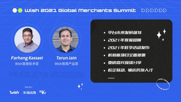 受疫情影响,虽然Wish总部的嘉宾无法来到大会现场,但包括 CTO Farhang Kassaei,CPO Tarun Jain在内的多位Wish高层将通过视频和现场的商户们见面,并带来 Wish 最新及未来规划的分享。