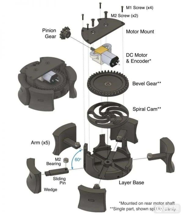 顶部由四层可变换的、模块化控制器组成,每层都有一个电机控制大小,可在5.7-7.7厘米(直径)改变大小。