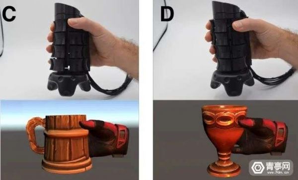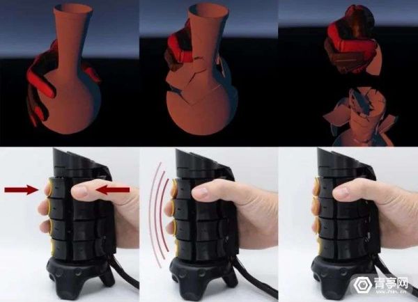 与此同时,握柄表面采用电容传感器,通过电流来判断每层传感器的抓握力度,由此还可以实现更丰富的玩法,例如结合真实手掌的抓握力度,握住可以轻松拿起一个瓶子,如果握力增大瓶子就会碎掉等。
