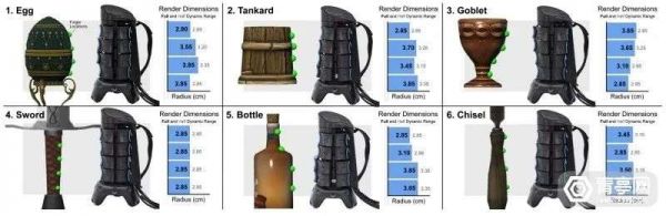 为了研究清楚这一问题,微软研究院还做了一项小规模对照测试。测试中,分别使用X-Rings手柄、常规握持形态的VR手柄,分别去抓握6种不同的物体(如上图),例如酒杯、玻璃瓶、剑等。