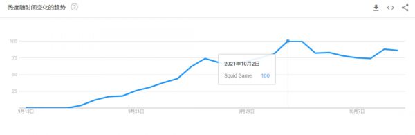 根据App Annie数据显示, 《 Candy Challenge 3D》上线时间为10月3日,正好是《鱿鱼游戏》开播后的两周。而更巧合的是,Google Trends数据显示,《鱿鱼游戏》在10月3号时热度达到峰值。