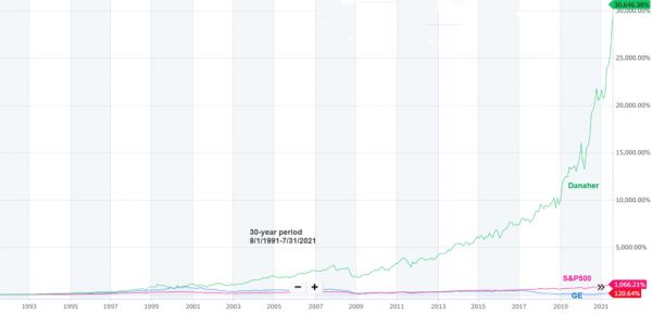从投资者的角度,从2021年中往回看30年,丹纳赫的股价增长超过300倍,远高于标准普尔指数的10倍和GE的1.2倍。如果在三十年前投资1万美元的话,投资丹纳赫今天会变成300万美元,而投资GE只能得到1.2万美元。