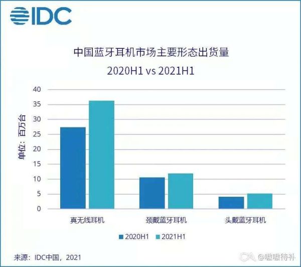 根据IDC《中国无线耳机市场季度跟踪报告,2021年第二季度》显示,2021年上半年中国无线蓝牙耳机市场出货量为5374万副,同比增长26.8%。其中,真无线耳机增长速度领跑整体蓝牙耳机市场,2021年上半年出货量3,625万台,同比增长32.1%。颈戴蓝牙耳机市场2021年上半年出货量1,189万台,同比增长12.2%。头戴蓝牙耳机市场2021年上半年出货量514万台,同比增长24.6%。