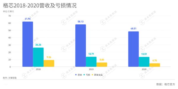 根据格芯在IPO申请文件中的数据,2018-2020三年间,格芯营收61.96亿美元、58.13亿美元、48.51亿美元,整体呈下降趋势,三年间其净亏损分别为26.26亿美元、13.71亿美元和13.51亿美元,也在不断收窄。